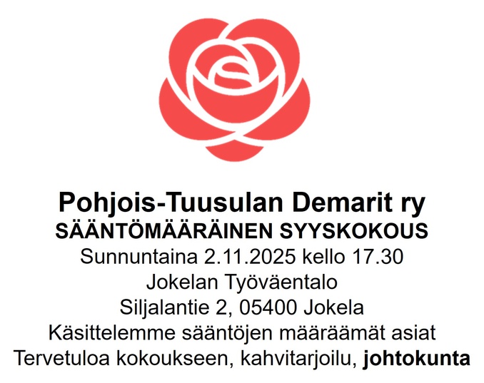Tulkaa keskustelemaan, jos vähänkin kiinnostaa läheteä vaikuttamaan oman kylän,Tuusulan tai hyvinvointialueen asioihin ja uskot demarien arvomaailman vastaavan omaasi, niin voit jättää ehdokashakemuksesi tilaisuudessa. Paikalla kuulet meille demareille tärkeistä vaikuttamisasioista!