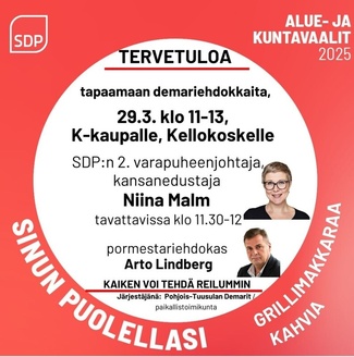 Tervetuloa lauantaina 15.3. klo 11-13 Jokelan K-kaupalle grillaamaan ja tapaamaan demariehdokkaita. Mukana on kansanedustaja Pinja Perholehto klo 11-11.45